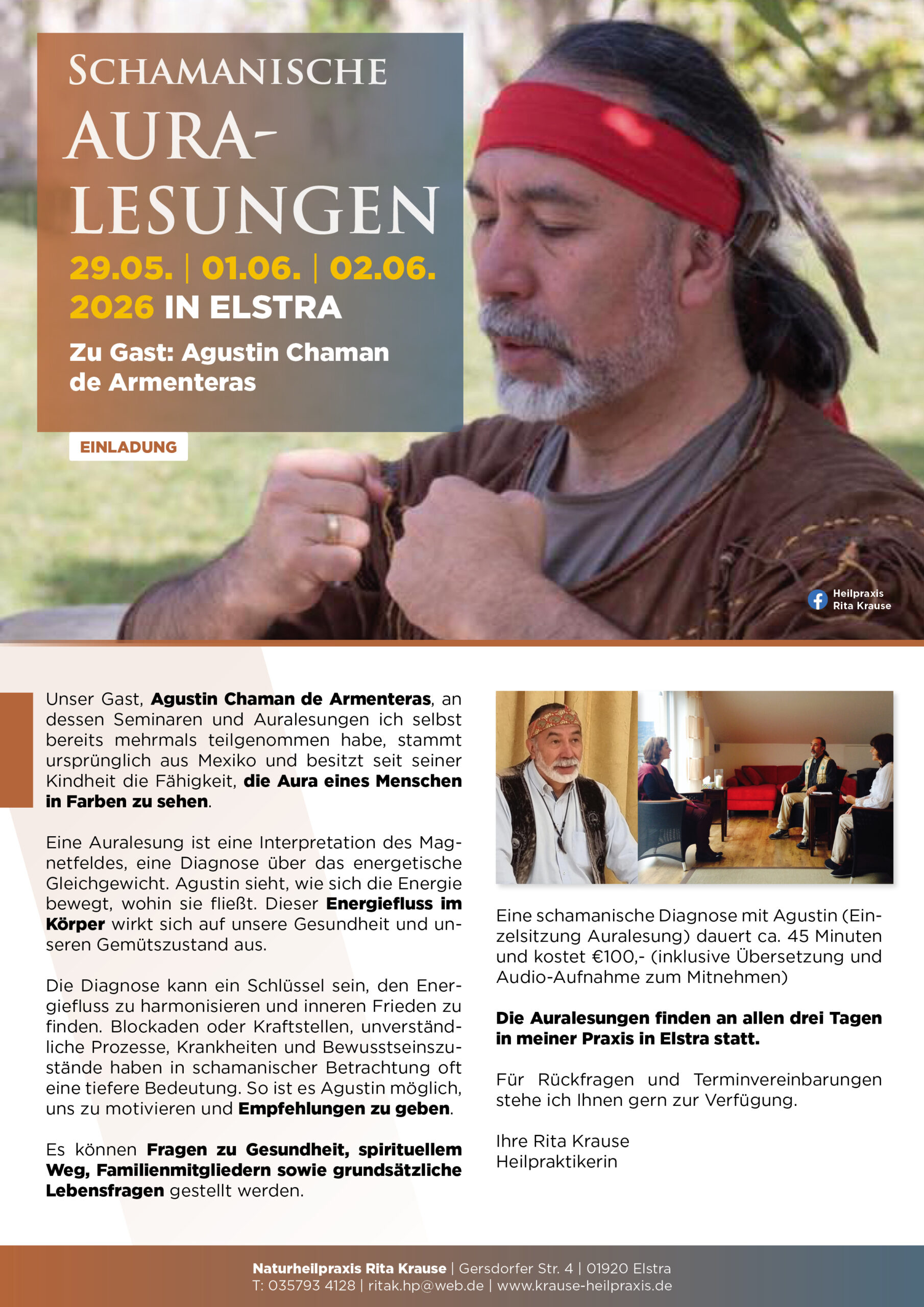 Agustin Chaman de Armenteras, an dessen Seminaren und Auralesungen ich selbst bereits mehrmals teilgenommen habe, stammt ursprünglich aus Mexiko und besitzt seit seiner Kindheit die Fähigkeit, die Aura eines Menschen in Farben zu sehen. Eine Aura-Lesung ist eine Interpretation des Magnetfeldes, eine Diagnose über das energetische Gleichgewicht. Agustin sieht, wie sich die Energie bewegt, wohin sie fließt. Dieser Energiefluss im Körper wirkt sich auf unsere Gesundheit und unseren Gemütszustand aus. Die Diagnose kann ein Schlüssel sein, den Energiefluss zu harmonisieren und inneren Frieden zu finden. Blockaden oder Kraftstellen, unverständliche Prozesse, Krankheiten und Bewusstseinszustände haben in schamanischer Betrachtung oft eine tiefere Bedeutung. So ist es Agustin möglich, uns zu motivieren und Empfehlungen zu geben.