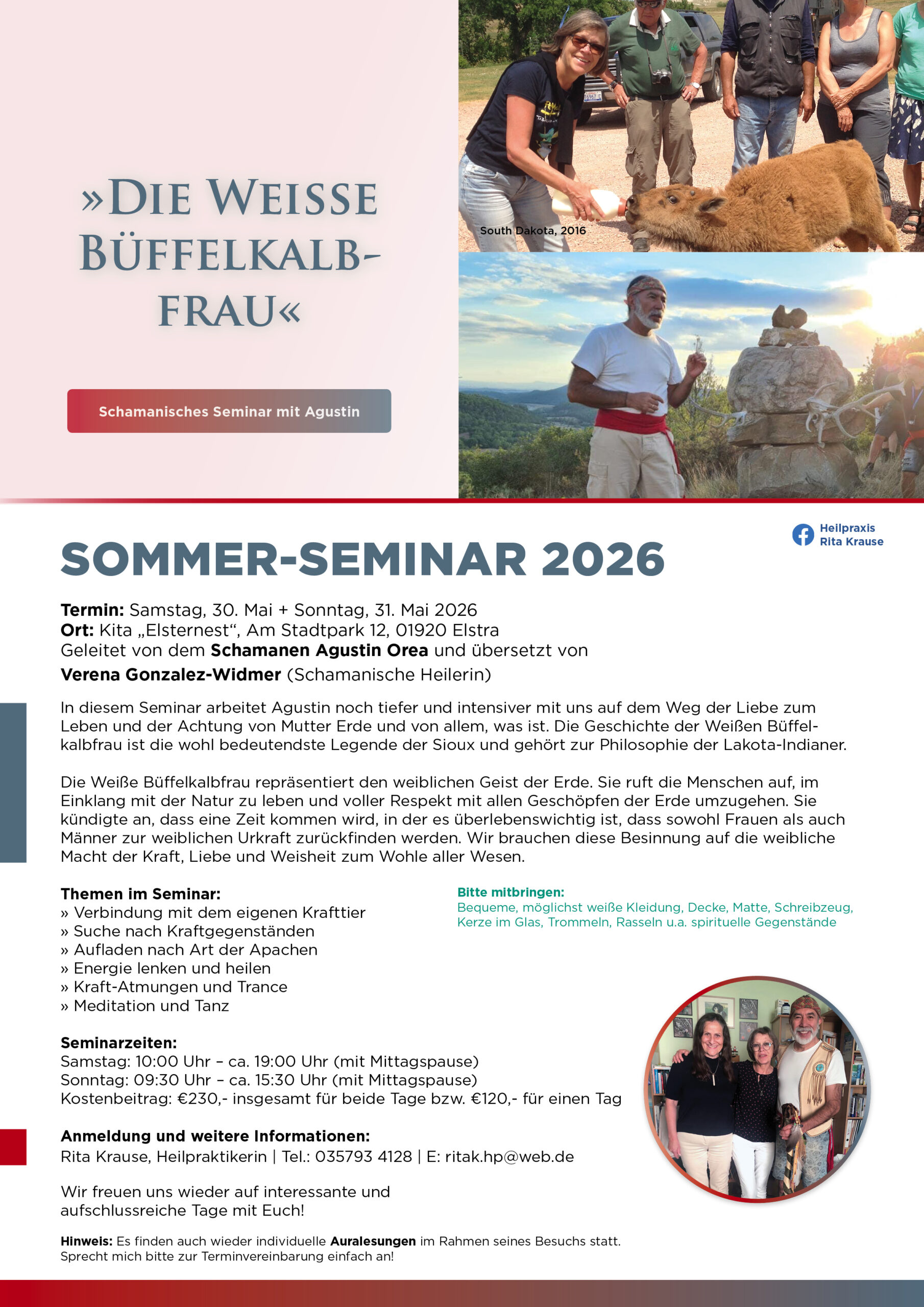 Eine schamanische Diagnose mit Agustin (Einzelsitzung Auralesung) dauert ca. 45 Minuten und kostet €100,- (inkl. Übersetzung und Audio-Aufnahme). Die Auralesungen finden an beiden Tagen in meiner Praxis in Elstra statt.